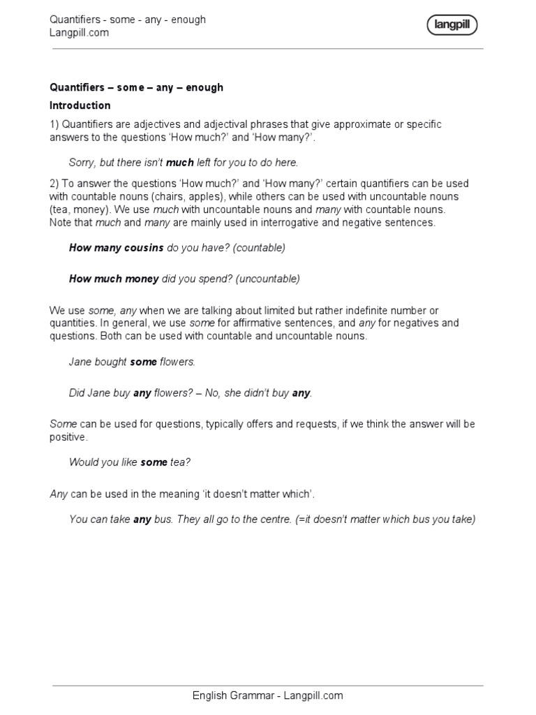 Quantifiers English Grammar : 'some', 'many', 'a lot of' and 'a few' are examples of.. A quantifier is a word or phrase which is used before a noun to indicate the amount or quantity: 1 types of quantifiers in english. Quantifiers with count and uncount nouns 4. ► you are here in modern spoken english, much, and to a lesser extent many are not often used as quantifiers in affirmative statements, unless introduced by an. Of something without stating the actually number.